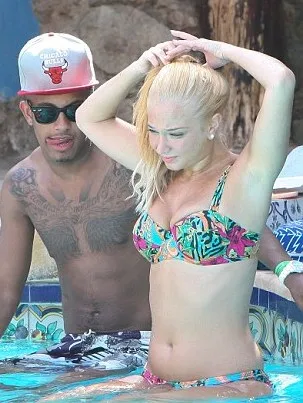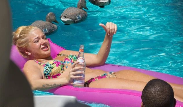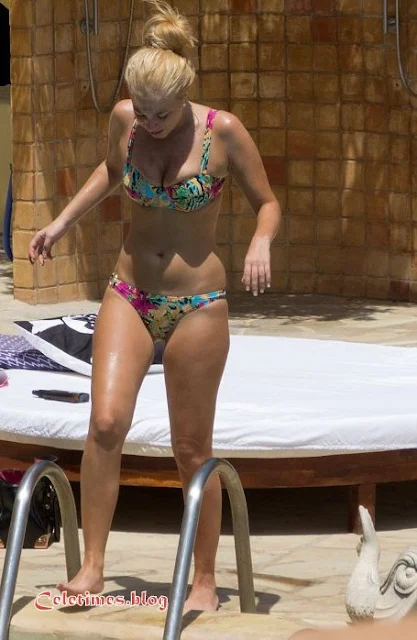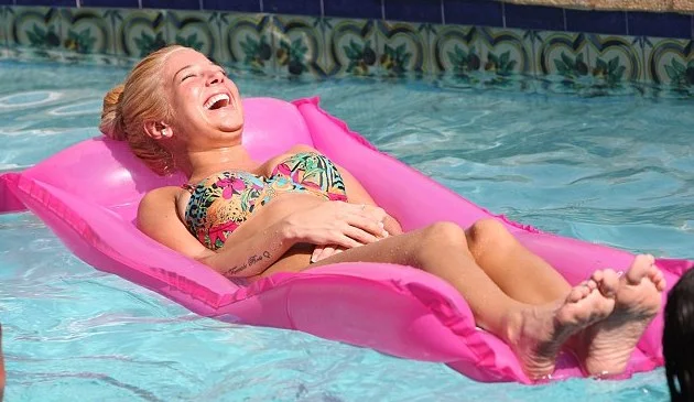 Re-hydrating with a bottle of water Tulisa relaxed on a lilo occasionally dangling her limbs into the water.